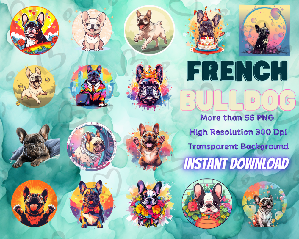 Experience the magic of our high-quality French Bulldog Clipart collection. Each set includes 56+ individual PNG files, meticulously designed at 300 dpi and sized 6144 x 6144 pixels. These high-resolution images are tailored for exceptional print quality, ensuring that your designs shine on wall art and other decor items.